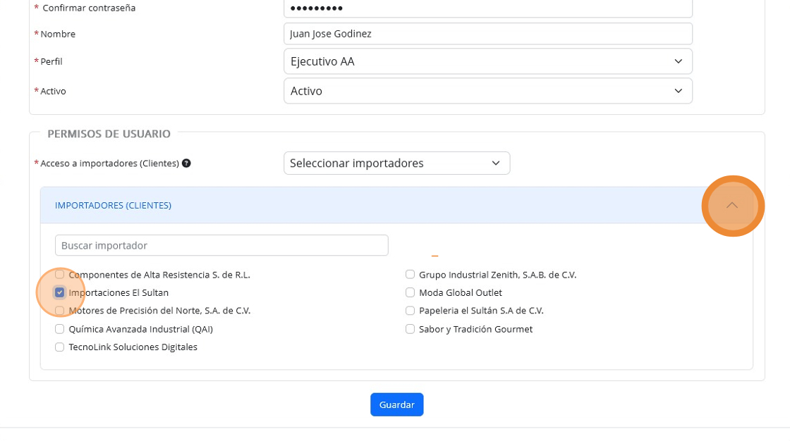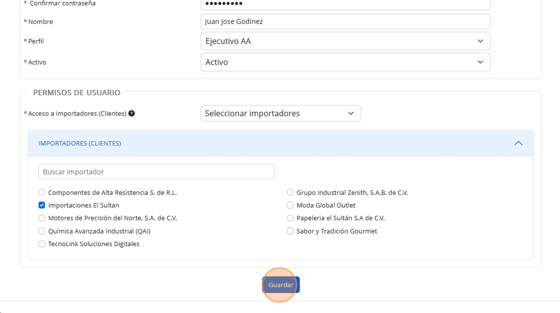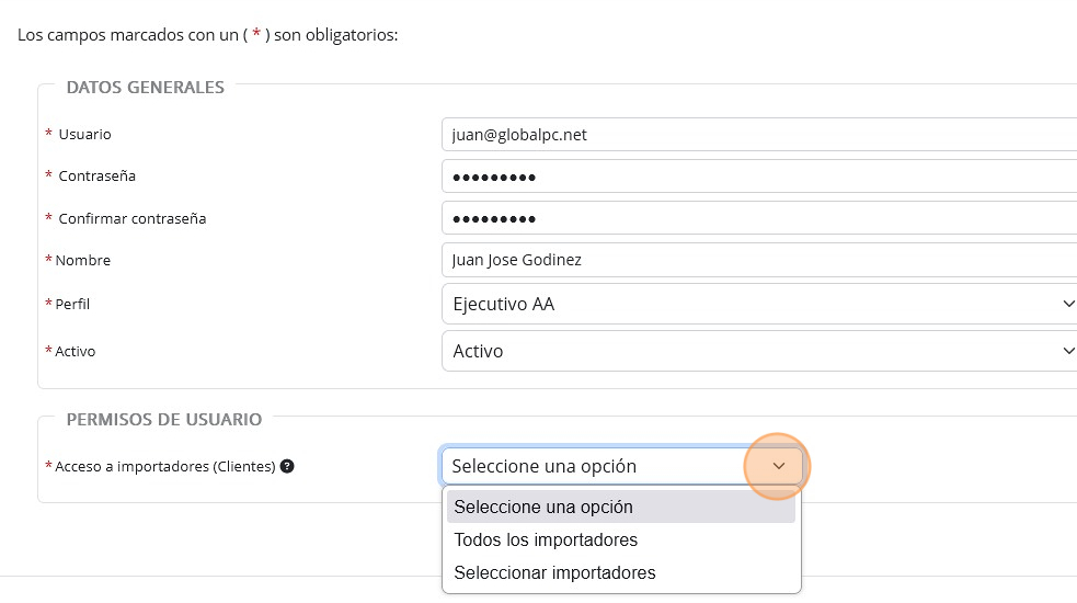 7. En la sección de 'Permisos de Usuario' podrá definir si el usuario con perfil Ejecutivo AA, tendrá acceso a la información de todos los importadores o solo a algunos en particular.