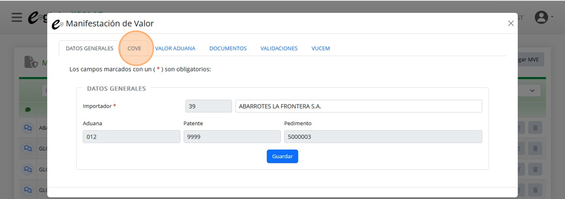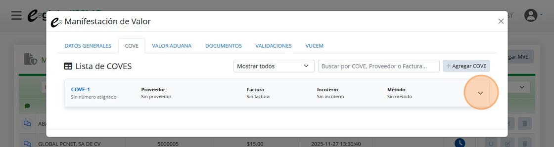 Esta opción permite al usuario agregar N cantidad de COVE's relacionados a la Manifestación de Valor.