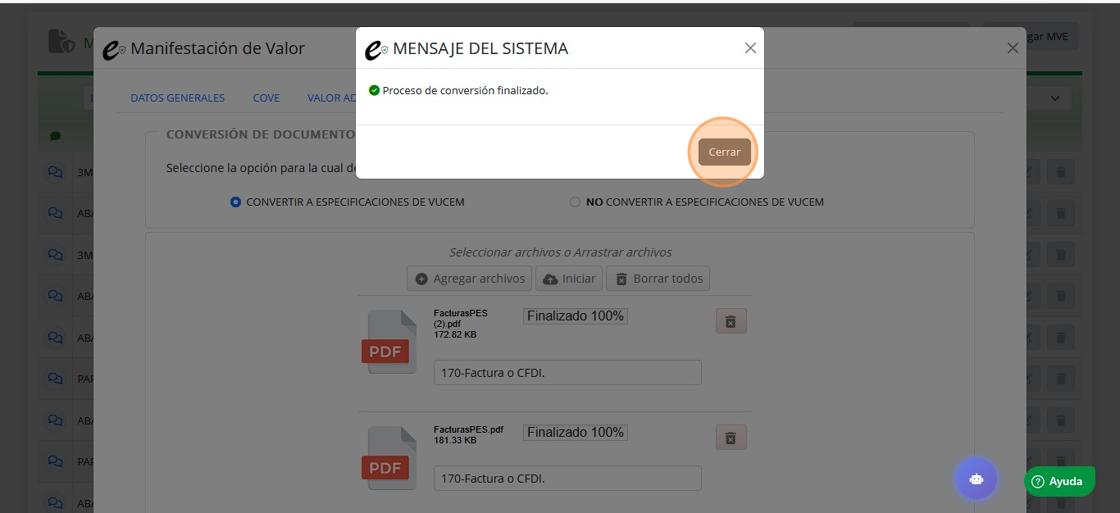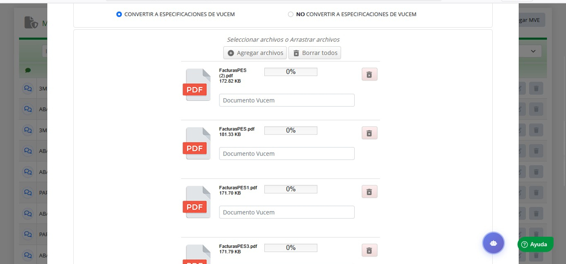 Tip: El sistema le permite subir archivos en formato PDF para su conversión a VUCEM.