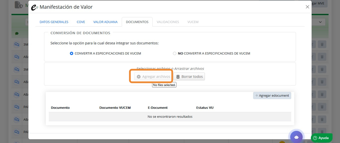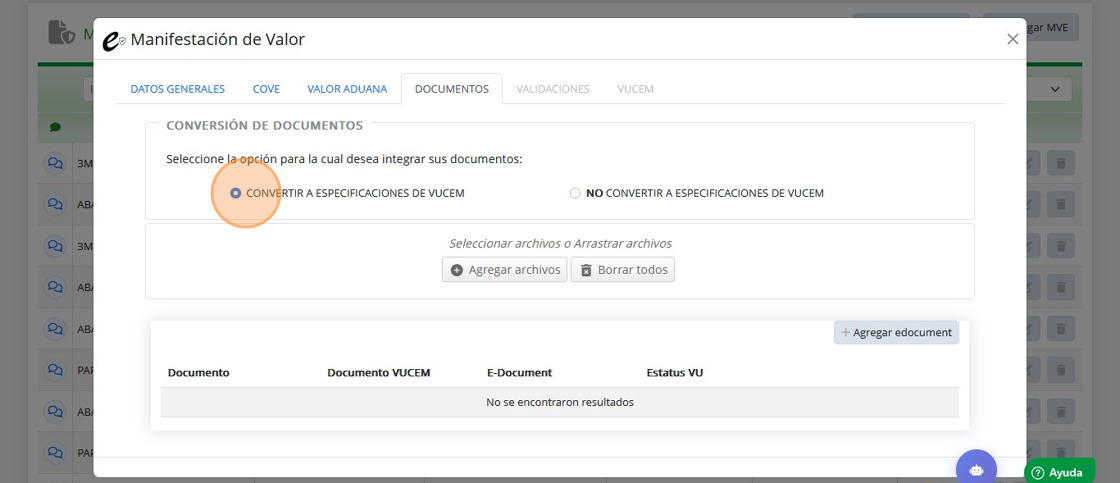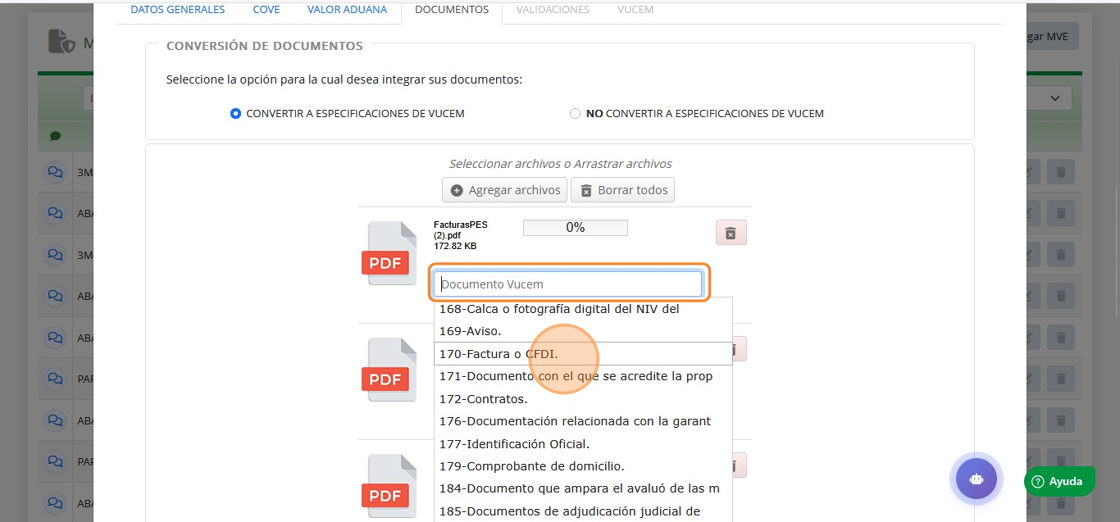 7. Para convertir los documentos con las especificaciones de VUCEM, en cada documento seleccione el tipo de documento del que se trata.